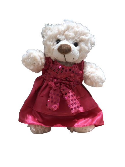 Ton cavalier t'as demandé de l'accompagner au bal ? Tu ne vas quand même pas y aller sans ta peluche ! Cette robe de bal est faite pour ta peluche. Le haut est en forme de débardeur, composé de sequins roses avec un joli nœud papillon sur la droite au niveau du bidou de ta peluche. Le bas de la robe est en tissu rose avec des volants.