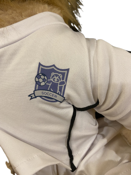 Cette tenue est un ensemble blanc de footballeur. Le haut du maillot est blanc avec un trait noir sur chacune des manches, et un trait noir sur le flanc du maillot. Le logo de l'équipe est en noir et blanc. Le logo est un ours à côté d'un ballon de foot. Il y a écrit "soccer" à la place du nom de l'équipe, cela signifie football en anglais. Au dos du maillot il y a inscrit le numéro 10, comme Mbappé. Le short est blanc avec un trait noir de chaque côté.